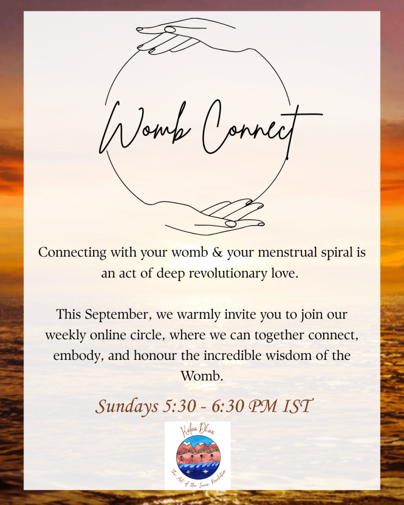 The journey will be hosted in a closed Facebook group, with Womben who have signed up for the course as members. Every morning, Arundhati from Kalaa Dhari will go live in this Facebook group and guide the participants through a core practice for the day. The comments section of each video will be used by the participants to share their experiences of doing the practice. On each Sunday, we will meeting for an hour for a live workshop that will take us through a deeper process in connecting with our Womb.