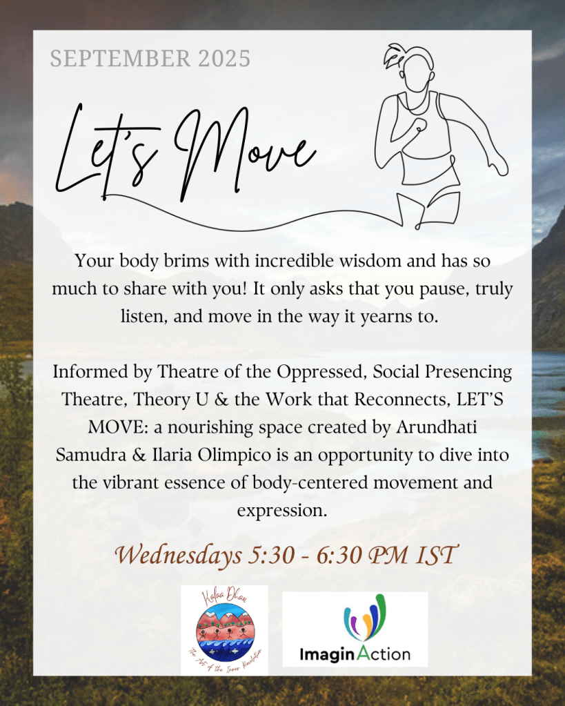 In the fast paced & busy world that we live in, Let’s Move is the oasis co-created by Ilaria Olimpico & Arundhati Samudra; a space where we can slow down to connect with the intelligence and wisdom of our bodies. It is a space where we move while allowing our bodies to guide us.