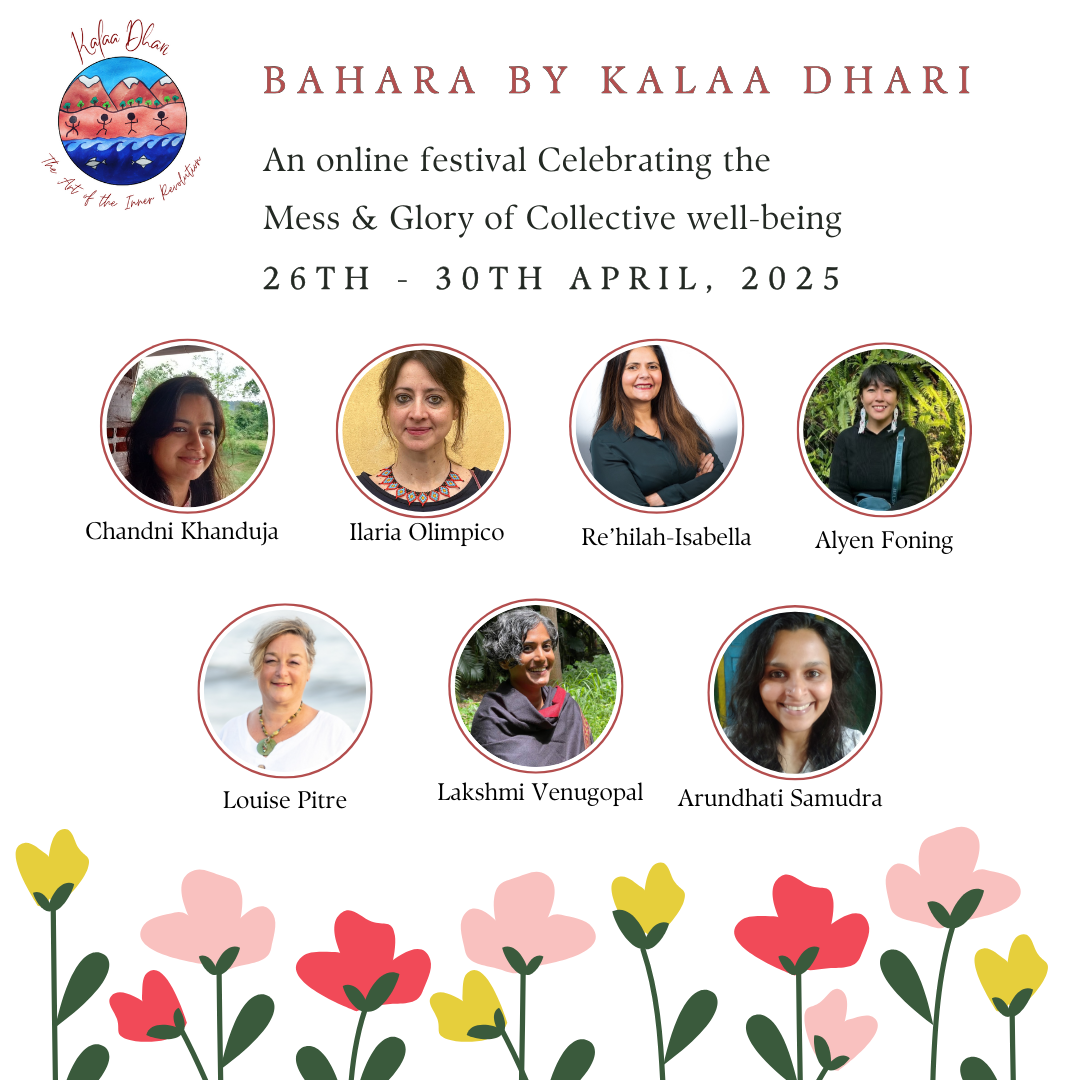 BAHARA by Kalaa Dhari is an international online festival that brings to you the work of 7 remarkable women leaders from across 4 countries and diverse landscapes; each presenting to you a unique modality rooted in transformative social arts and well-being.